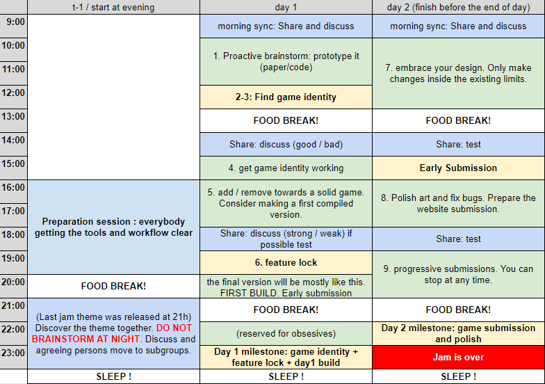 Each of these thirds is divided into 2-3 hour sprints (3 sprints per day in a 72h jam), so you can take a break and check on your team. Two hours is a good time to test something, without losing your main objective. Worst case, you waste 2 hours.